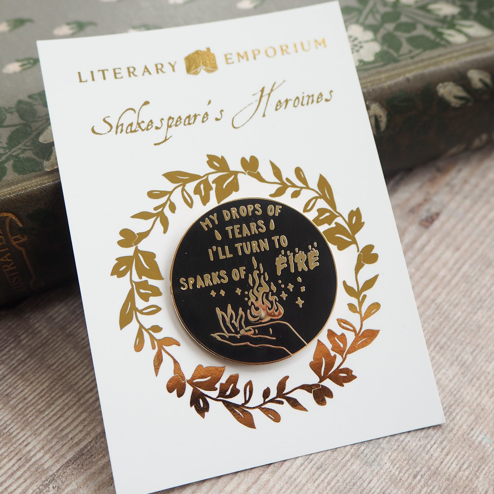 Part of our Shakespeare's Heroines collection, this black and gold enamel pin has bold flame design and is inscribed with the quote: "My drops of tears I'll turn to sparks of fire." - Act II Scene IV