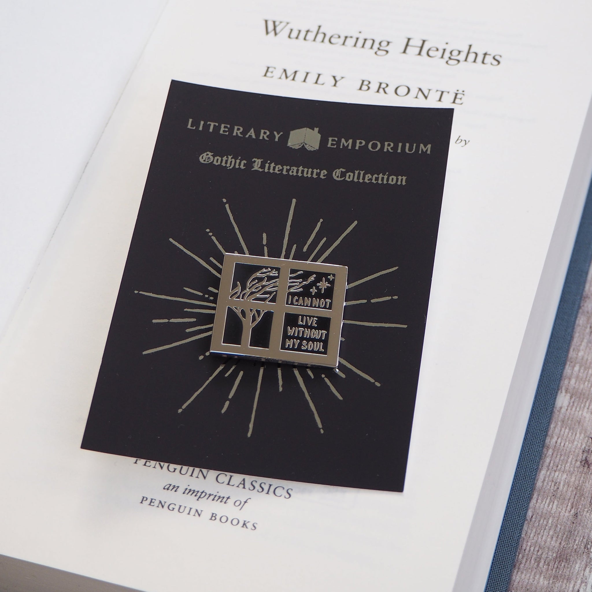 A Wuthering Heights inspired enamel pin badge depicting the famous window scene and inscribed with a quote from the book.