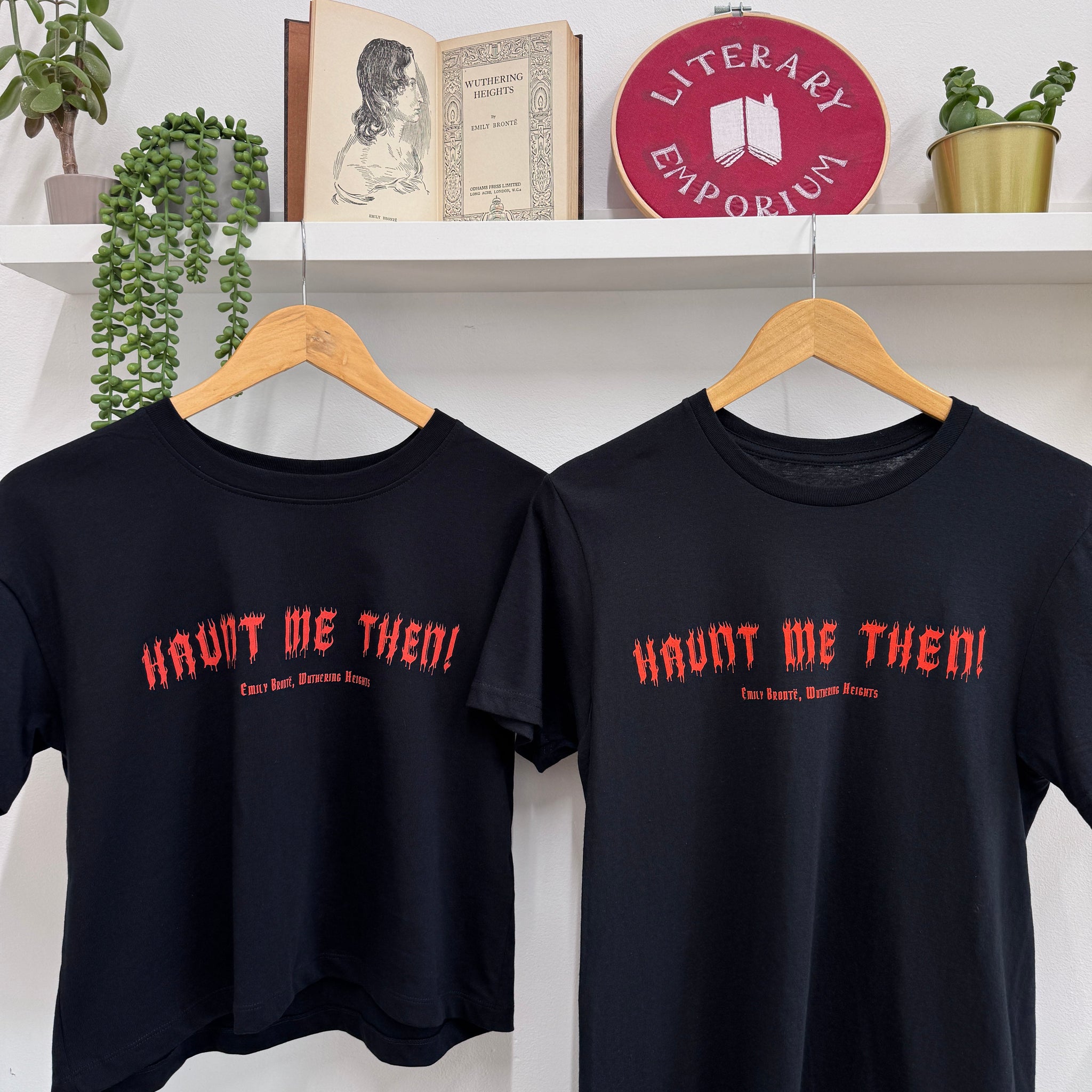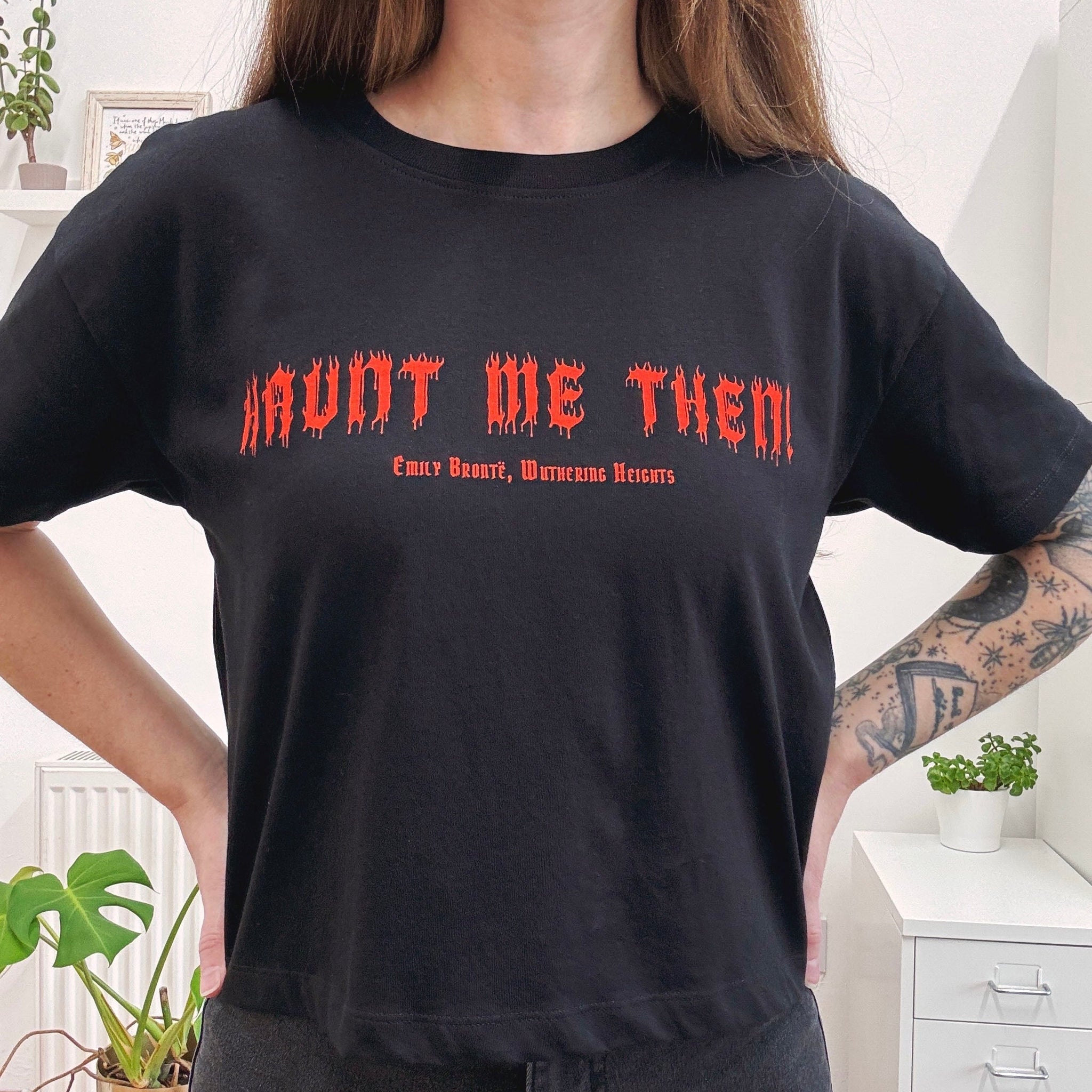 “Haunt me then!” appears in striking red metal lettering on a black cropped tee, blending dark academia with band-merch energy. It is obsessive, furious, and unapologetically dramatic, just as Emily Brontë intended.